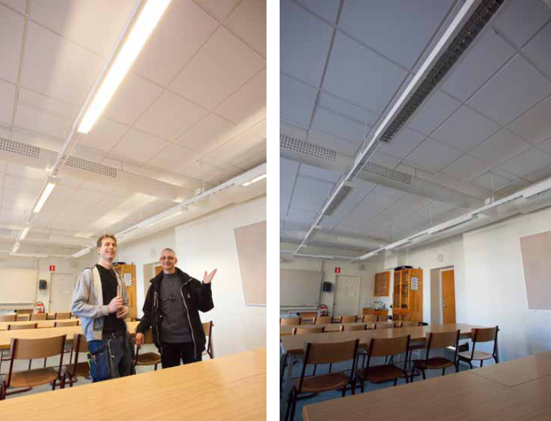 – Vi testade först med att ha det så att det tändes upp automatiskt när man t.ex. kom in i klassrummet. Men det visade sig inte vara någon bra lösning. För ibland kanske någon bara ska snabbt in och hämta en kvarglömd väska och då blir belysningen stående på i onödan. Med vår frånvarostyrning måste man tända upp belysningen manuellt. Det har visat sig fungera mycket bra, säger Peter Kindblom och fortsätter; – Elektroskandias belsyningskoncept för klassrum följer det som vi förordar i våra krav. Med det här onceptet där man får en komplett lösning på ett E-nummer innebär givetvis en stor förenkling för de konsulter och installatörer som vi arbetar med. Vi har låtit installera Elektroskandias lösning i flera skolor, med mycket gott resultat. Att nu styrenheten är förprogrammerad underlättar givetvis för installatören ännu mer.